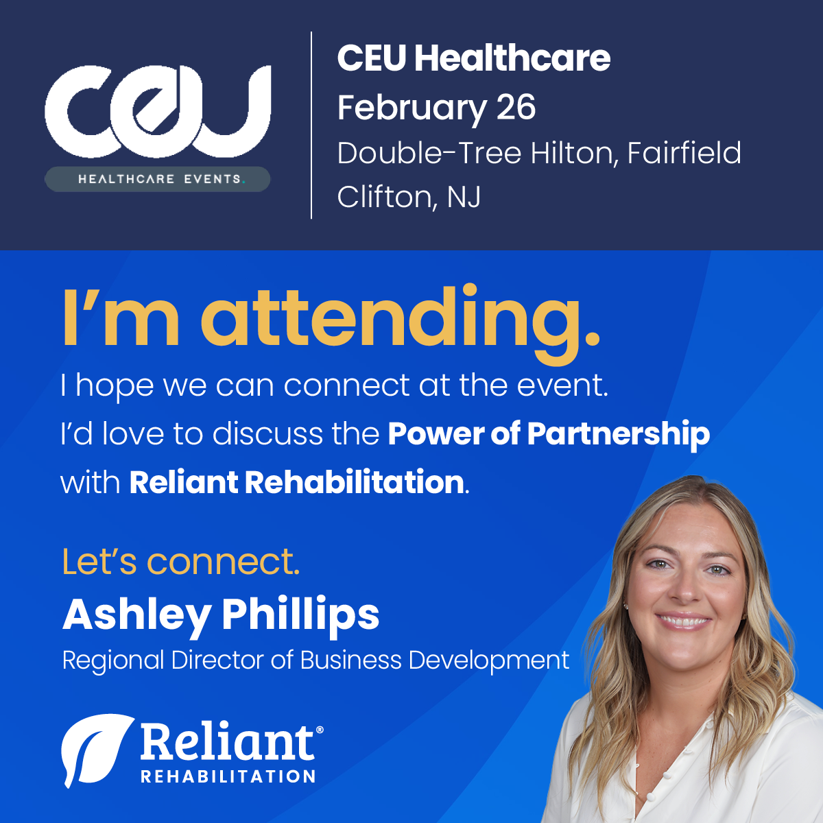 We’re proud to attend CEU Healthcare on February 26 in Clifton, New Jersey. Meet Ashley Phillips and learn how partnership with Reliant Rehabilitation makes a difference.